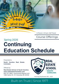 90 hours, split over two courses: Unit I - 60 hours; Unit II - 30 hours. Comes with ebook for both courses, Unit I class powerpoints, extensive South Carolina Real Estate License Exam Prep ebook. Choose in person, virtual or self-paced online.